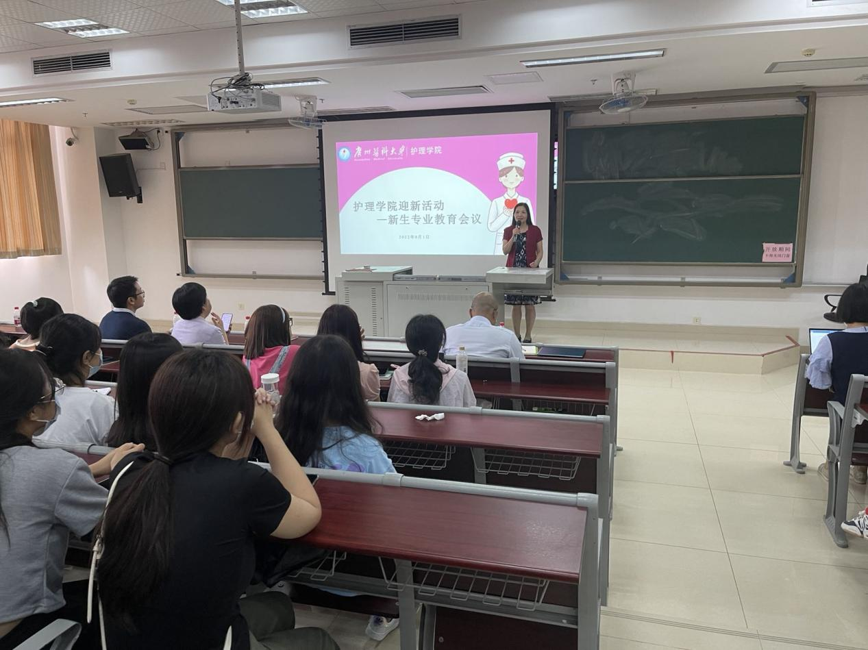 在番禺校区A3-224教室举办了2022级新生专业教育会议。学院领导雷丽琼书记、徐学虎副院长、黄美凌副院长、办公室叶盛主任、教研办韩媛主任、学生办黎泽华老师、2022级护理专业兼职班主任及2022级护理学专业全体同学参加了本次活动。
