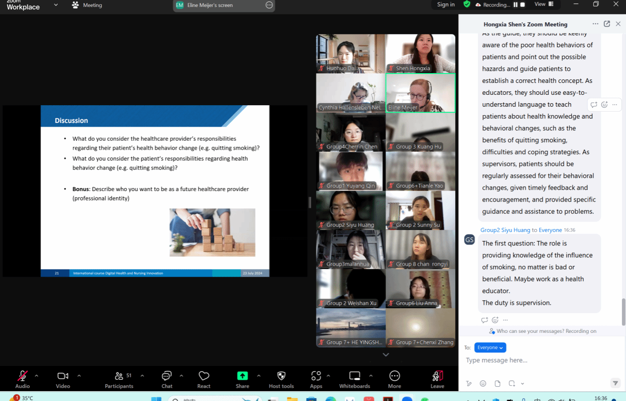 9月20号下午,国际共建课程《数智赋能与护理创新》线下座谈会在p站视频 会议室召开,5位学生代表参加了本次座谈会(其中一位澳门镜湖p站视频 学生作线上分享)。同学们均肯定了本次国际课程的学习成效,学习了数智时代下医疗健康资源管理的相关知识、运用于现代医疗和护理服务管理转变的新兴技术、护理创新的重要性以及数智赋能下的护士创新角色和方向,拓展了同学们的国际视野。同时小组工作坊撰写研究计划的课程内容,让同学们通过团队合作,案例分析,项目驱动等多种方式,在实践中、学习中获得成长。今后p站视频 将继续做好数智创新融合的国际课程共建,同时开展全方位、多层次的教育及研究交流和合作,进一步惠及更多学生。