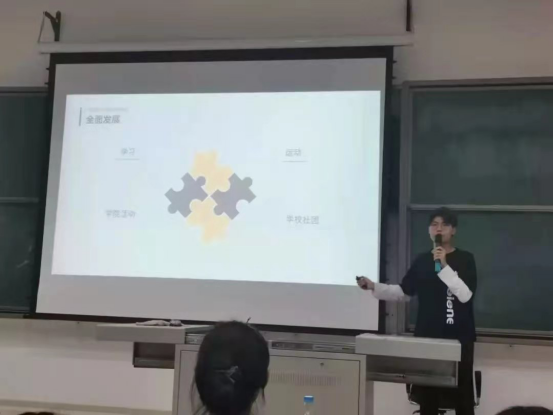 学生会主席董岩同学通过“考试科目”、“学习技巧”、“时间安排及单科介绍”、“如何处理学习与社团的关系”四个方面,并加以自身事例说明,详细地与同学们分享了自己大一时的学习经历,在场的同学们获益匪浅。