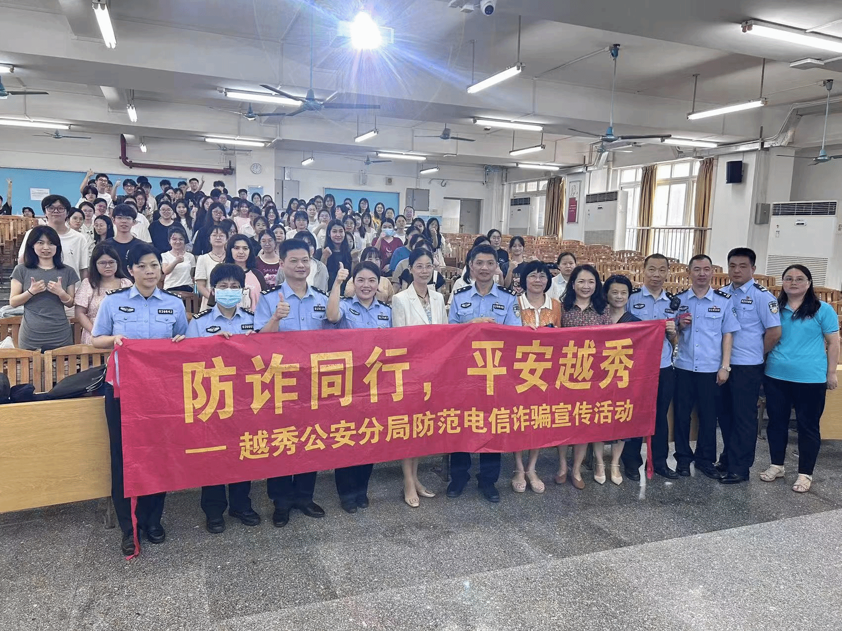联合保卫处、六榕派出所、越秀公安分局在越秀校区10-5A开展以“防诈反诈”为主题的违法违纪专题教育大会。参加此次活动的有六榕派出所贾安健所长、越秀公安分局张冬敏副大队长、罗可弟警官、何擎柱警官;学校保卫处曾淑华科长;学生处赵妍老师以及p站视频