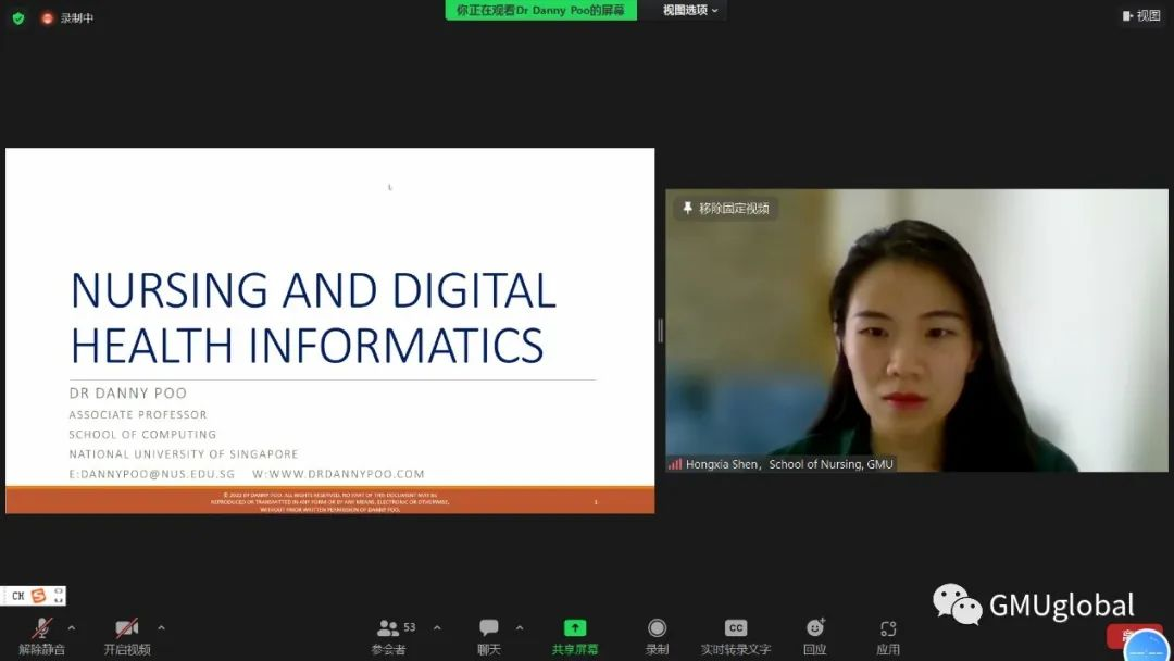 “由衷感谢学校及学院为我们同学们及教师搭建了一个优秀的学习提高平台,新加坡国立大学DannyPoo教授以目前信息学的应用实例、丰富的信息学知识以及精湛的理论讲解等阐明了健康信息学如何帮助管理和处理数据、信息和知识,以支持医疗和医疗服务的实施。在疫情期间,能够采用线上手段,突破空间和时间的限制,将国外的资源充分利用,为同学们提供一场学术盛宴对于同学们的未来发展有极大的好处。”