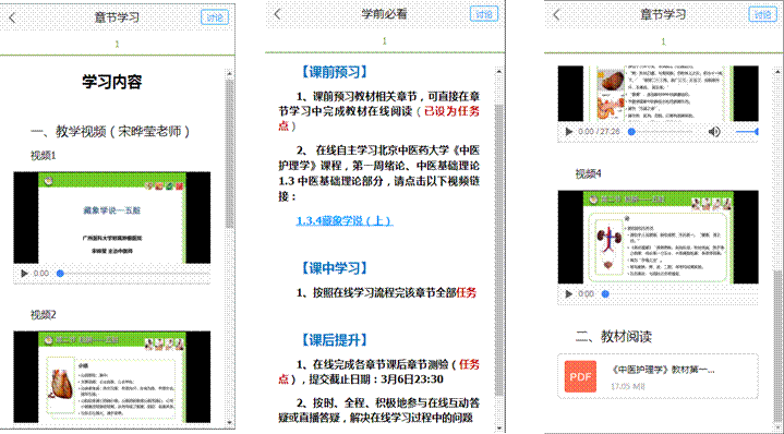 线上教学按照课前预习(教材阅读+中国大学MOOC)、课中学习(视频+教材阅读+其他文献资料阅读)、课后复习(自测题+讨论+教师集中答疑)的形式组织同学们在线学习。