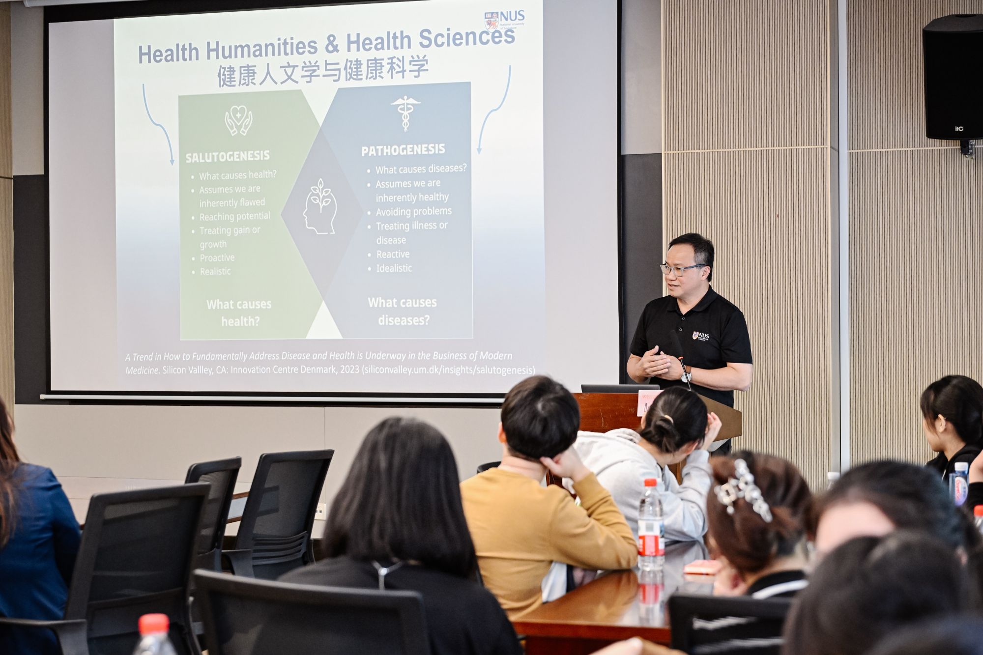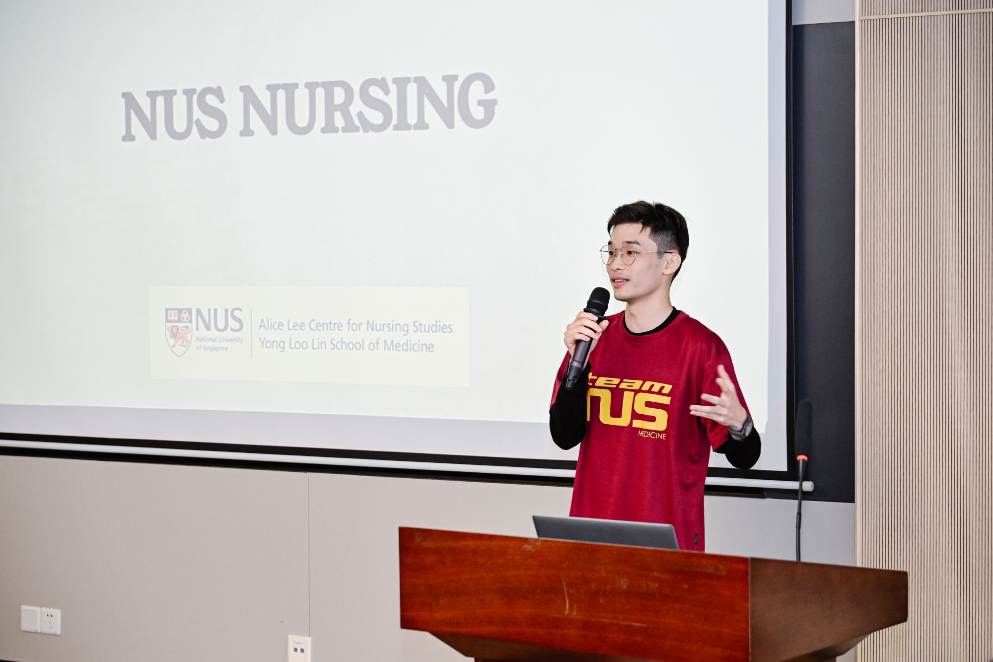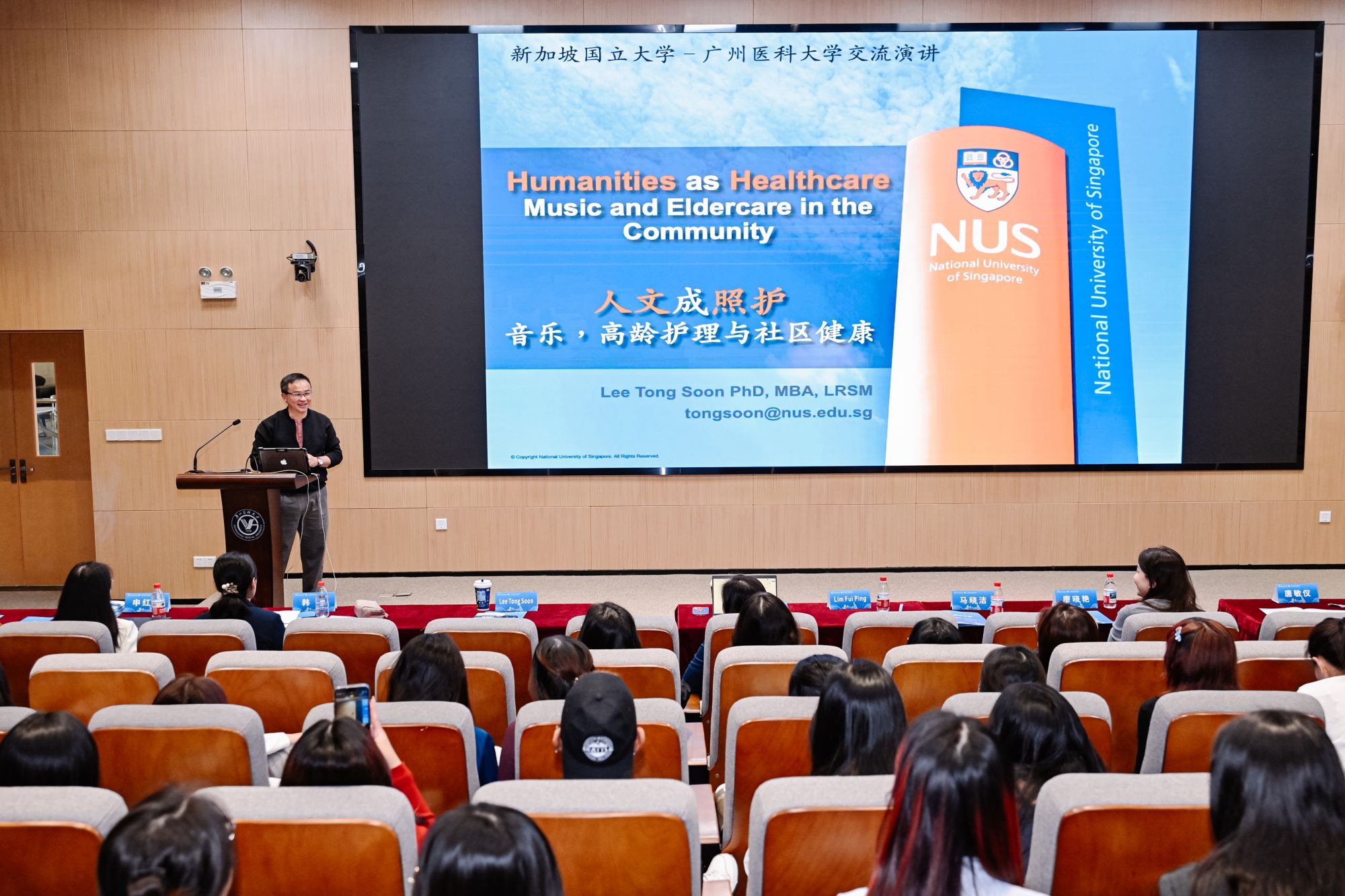 韩媛副院长主持。双方项目负责人简要介绍了本校基本情况及护理人才培养模式,为后续交流奠定基础。随后,新加坡国立大学Lee Tong Soon博士以“人文即医疗”为主题,分享了音乐艺术在老年护理中的创新应用。我校申红霞博士则介绍了我校慢性病数字化管理方面的研究成果,展现了科技助力护理发展的实际路径。