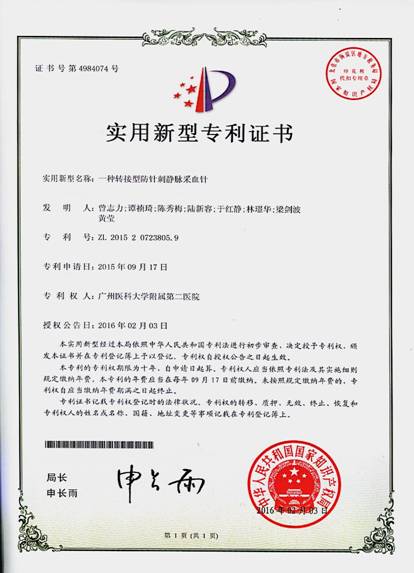 他并没有在此止步,抱着试一试的心态去申请国家专利保护。从专利文献检索、专利申请流程熟悉到专利申请书的书写,历经快3年的时间,终于实现了从“0到1”的突破,获得了第一项国家实用新型专利的授权--《一种转接型防针刺静脉采血针》(见图6)。这一次成功的尝试,大大鼓舞了他对工作钻研与创新的热情,这也促使他接下来的几年里,有了更多的创新成果。