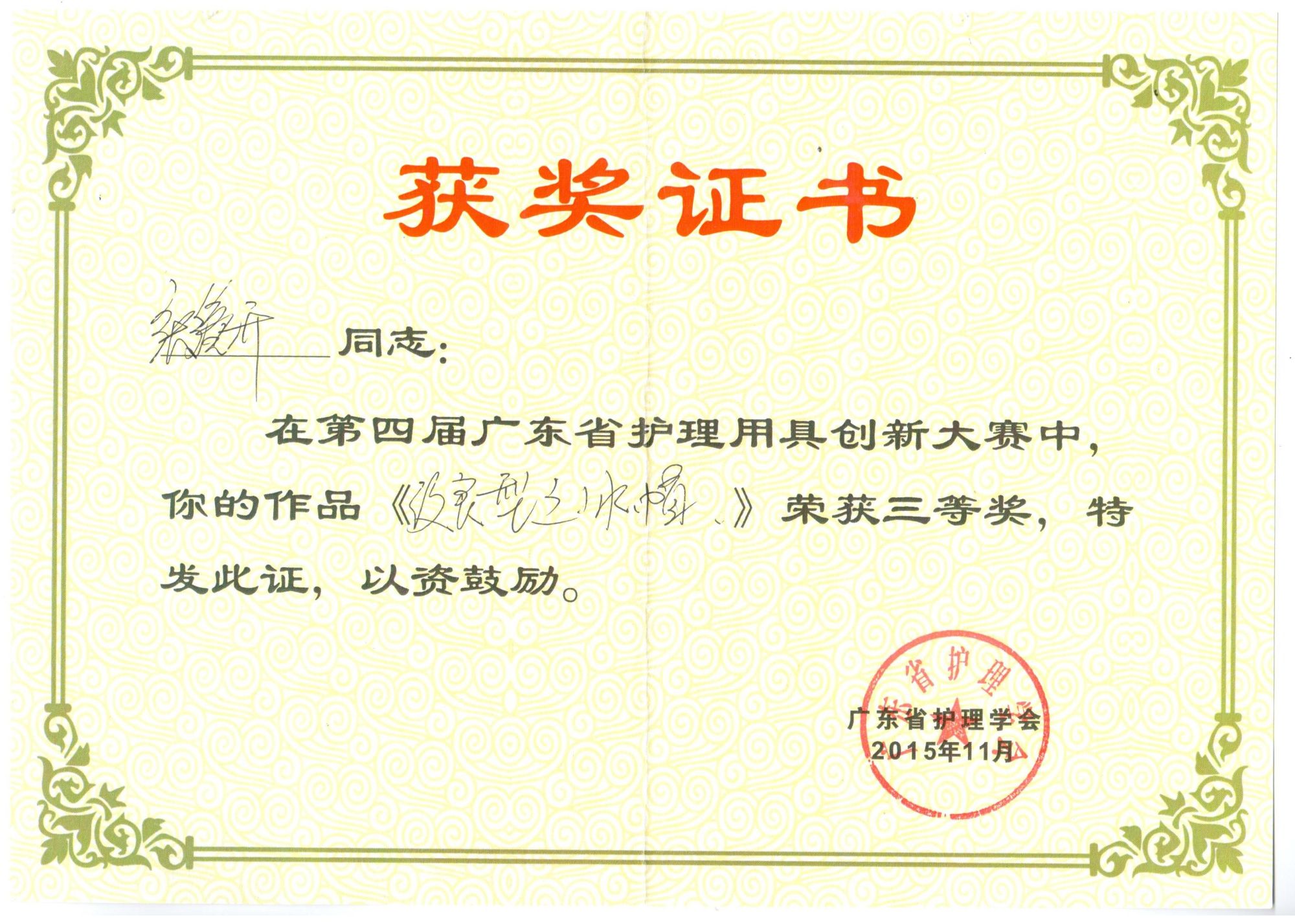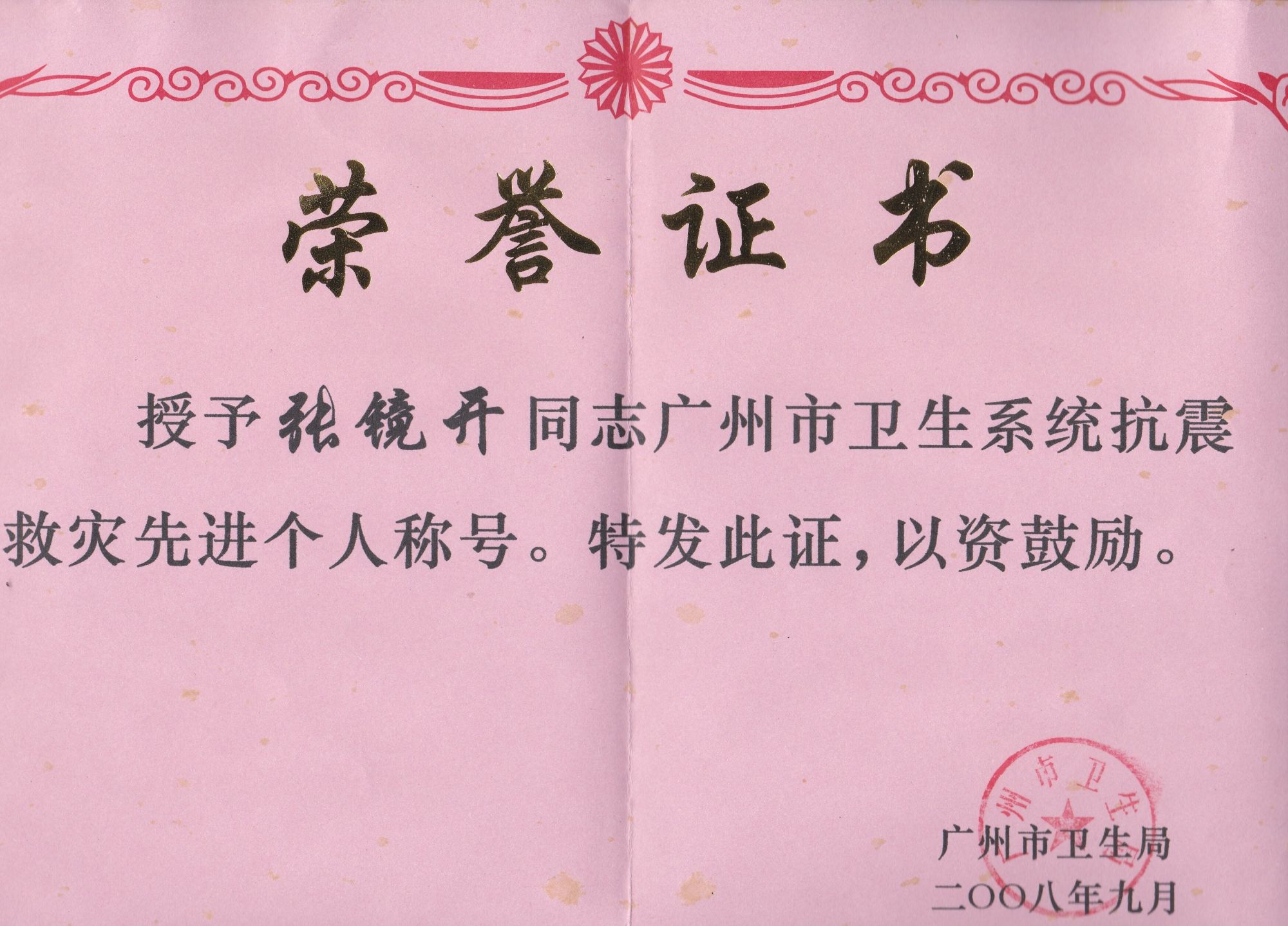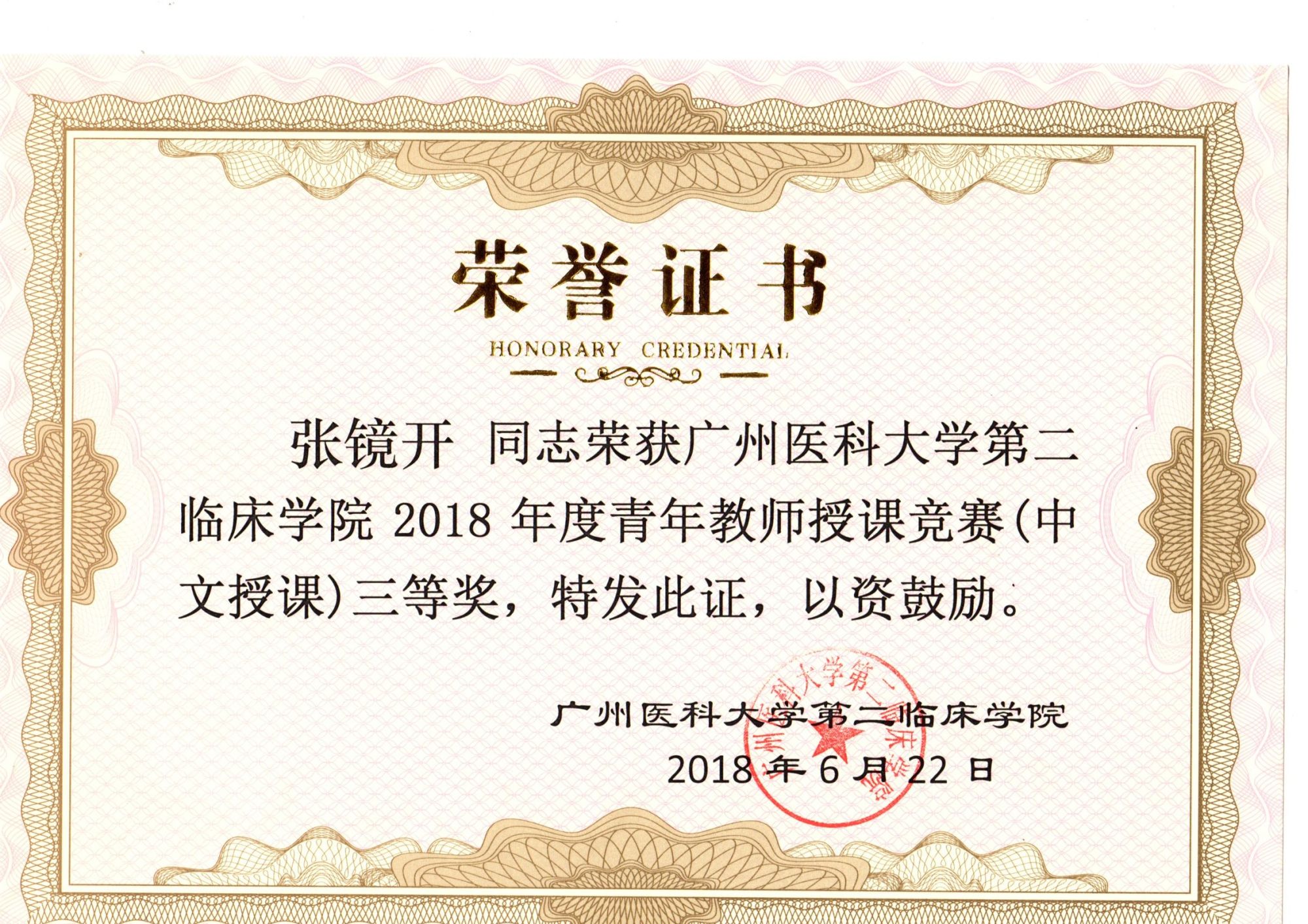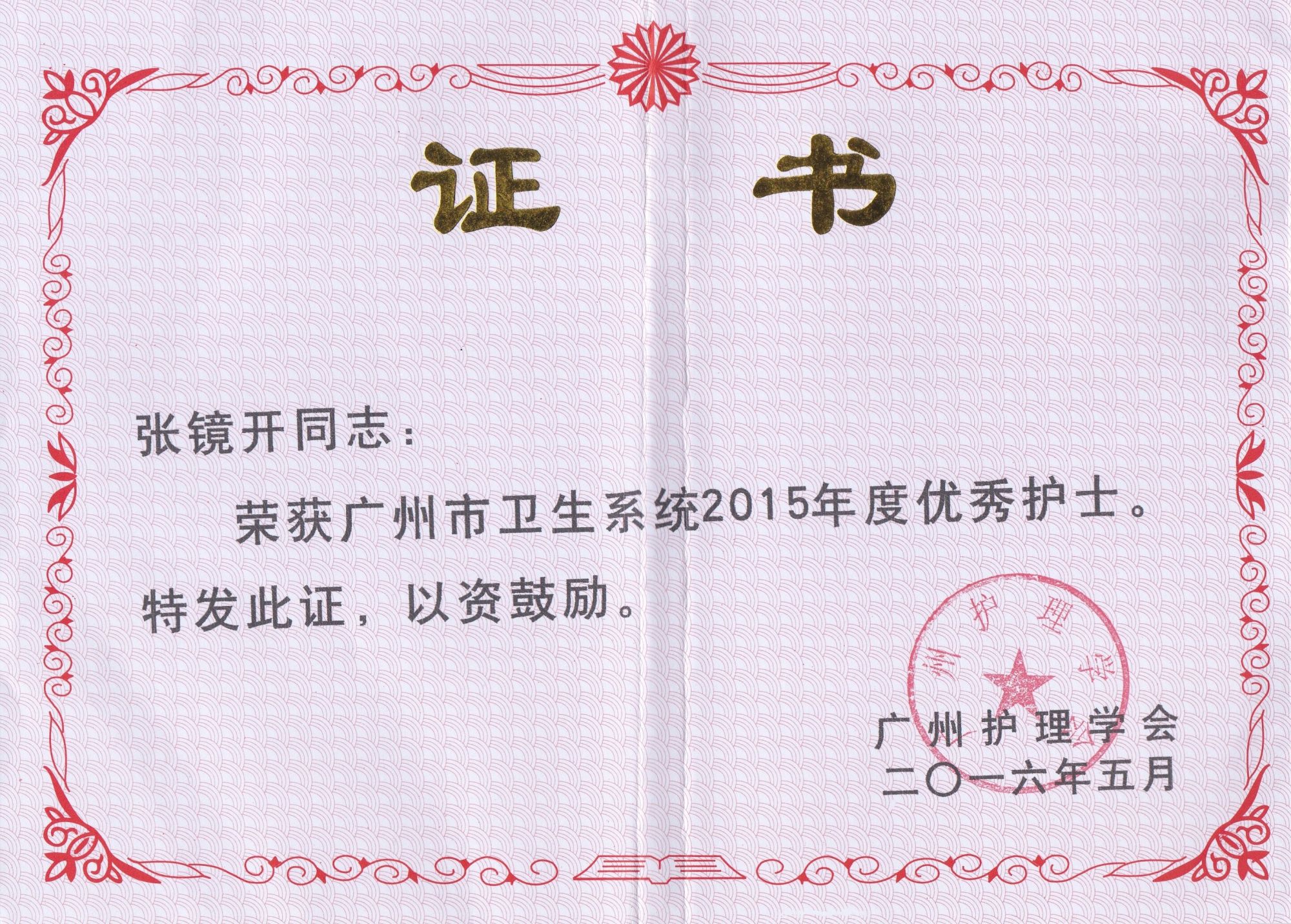 附属第一医院的进修学习,张镜开已熟练掌握了各种抢救与配合的知识与技能,如高质量CPR、气管插管、电除颤、机洗胃、体外起搏、呼吸机使用、ECMO使用及配合等,也对临床工作的良好运行有深刻体会,协助制定急诊分诊标准,胸痛、卒中中心工作指引等,良好的工作效果得到了组织的认可。他曾2008年奔赴汶川当地完成“抗震救灾”医疗支援工作,获得“广州市抗震救灾先进个人称号”;完成2010年第16届亚运会及亚残会等多次医疗保障工作;担任多次如横渡珠江,广马,广交会等医疗保障,均出色完成任务。疫情期间,他坚守第一线,奔赴广州市第八人民医院肩负负压转运工作,出色完成任务。他时刻保持对生命的敬畏之心,为有效救治患者竭尽全力,获得医德医风优秀个人称号;他对科室建设尽心尽力,从分诊信息系统的建设,抢救与配合流程的建立与改善,疫情期间各种指引、流程的制定、落实于质控都渗透着他的努力。2018年张镜开任急诊分诊抢救区护士长,期间工作认真负责,兢兢业业,履行护士长的职责,配合科室推广新技术与进行培训工作。他带领护理团队紧跟科室步伐大力发展起在周边影响较大的较新的急诊分诊信息系统,也更好的贯彻国家“急诊患者分级分区,按病情处置”的宗旨。带领护理团队从对ECMO(体外膜肺氧合)的一无所知到能独立开展,工作效果得到了肯定。进行“创新型冰帽”QCC项目,这个项目获得了医院的QC项目二等奖以及第二届省护理用品创新大赛三等奖。从2008年开始,他开始负责临床带教工作,含省级、市级专科护士,进修,轮科,实习,见习,学院在校学生等各层次护理人员进行带教和授课,教学效果得到了各方的肯定,期间制作人卫慕课及参与授课比赛并获奖。出色的工作得到了肯定,张镜开曾获国家级的急诊医疗改善奖,广州市优秀护士称号、2次获得病区护理质量奖,3次获得医院优秀护士称号。