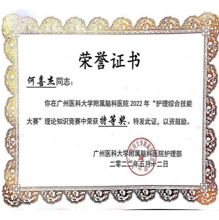 2019年参加广东省精神心理专科护士培训班,成为一名精神心理专科护士,担任院VTE护理会诊小组成员和院内外授课老师,2022年获得“青年教师教学查房比赛”三等奖。