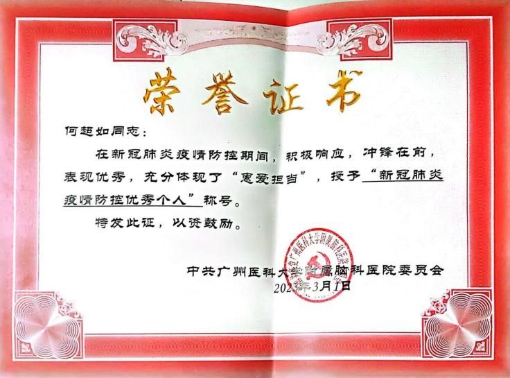 附属市八医院隔离区工作,表现优越,获得“新冠肺炎疫情防控优秀个人”称号。