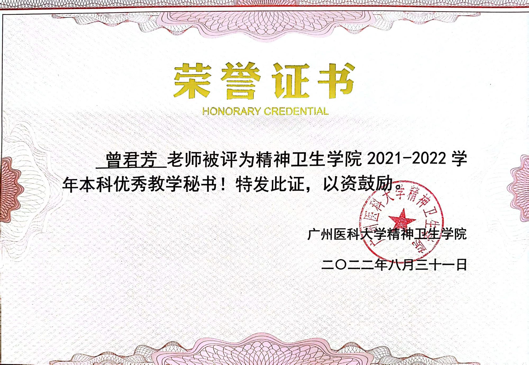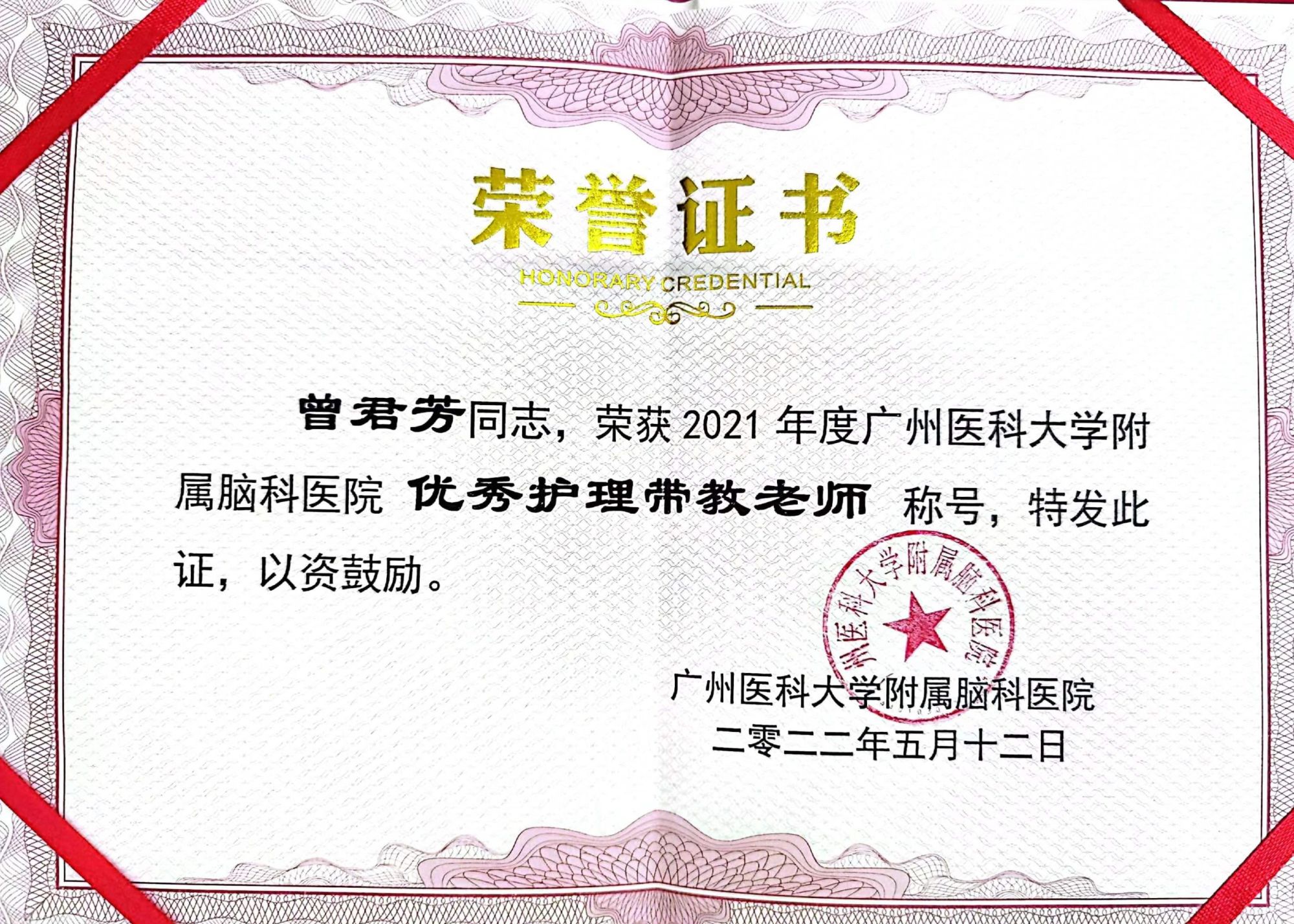 个人先后获“广州市护理学会优秀会员”“优秀护士”“优秀教学秘书”“优秀带教老师”“年度专利奖”荣誉称号。