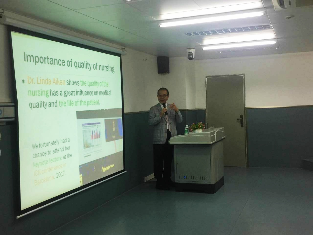 2018年3月19日,日本名古屋大学太田腾正教授(Professor Katsumasa Ota)及其3名研究生、香港理工大学前副校长汪国成教授(Professor Thomas Wong)和香港东区尤德夫人那打素医院高级护理经理苏思弦博士(Dr Gloria Aboo)来我校p站视频 访问交流并进行学术讲座。p站视频 周英、黄美凌副院长、教师、临床护士、研究生及部分本科生齐聚学院1020教室,参加讲座。