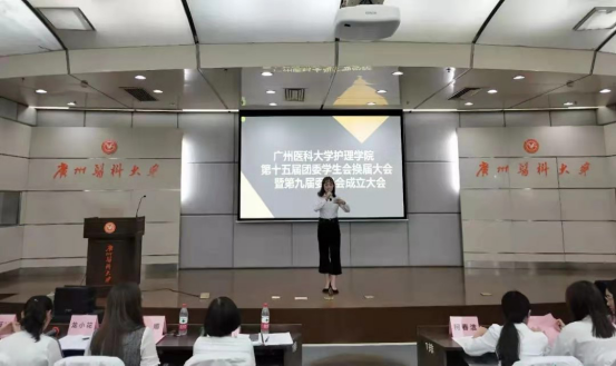 接着,第十五届团委学生会主席柯春洁对2018-2019学年团委学生会工作进行总结,提到了在这一年里,团委学生会紧跟时代步伐,开展了一系列团委活动和学生活动,取得了优秀的成绩,也丰富了同学们的课余生活,最后柯春洁主席表达对新一任的主席团的期待,希望大家继续让护院发光发热,为同学们服务。