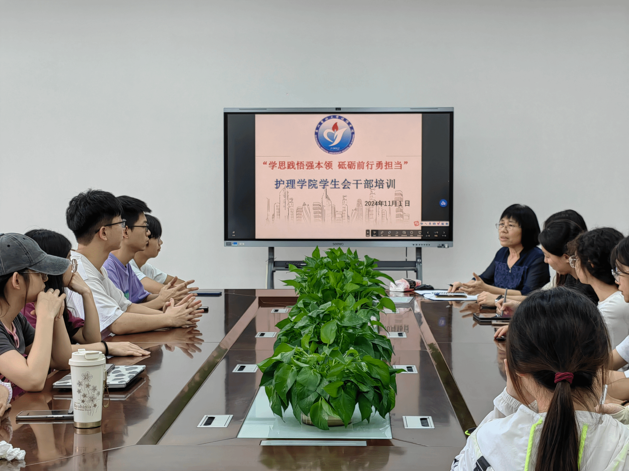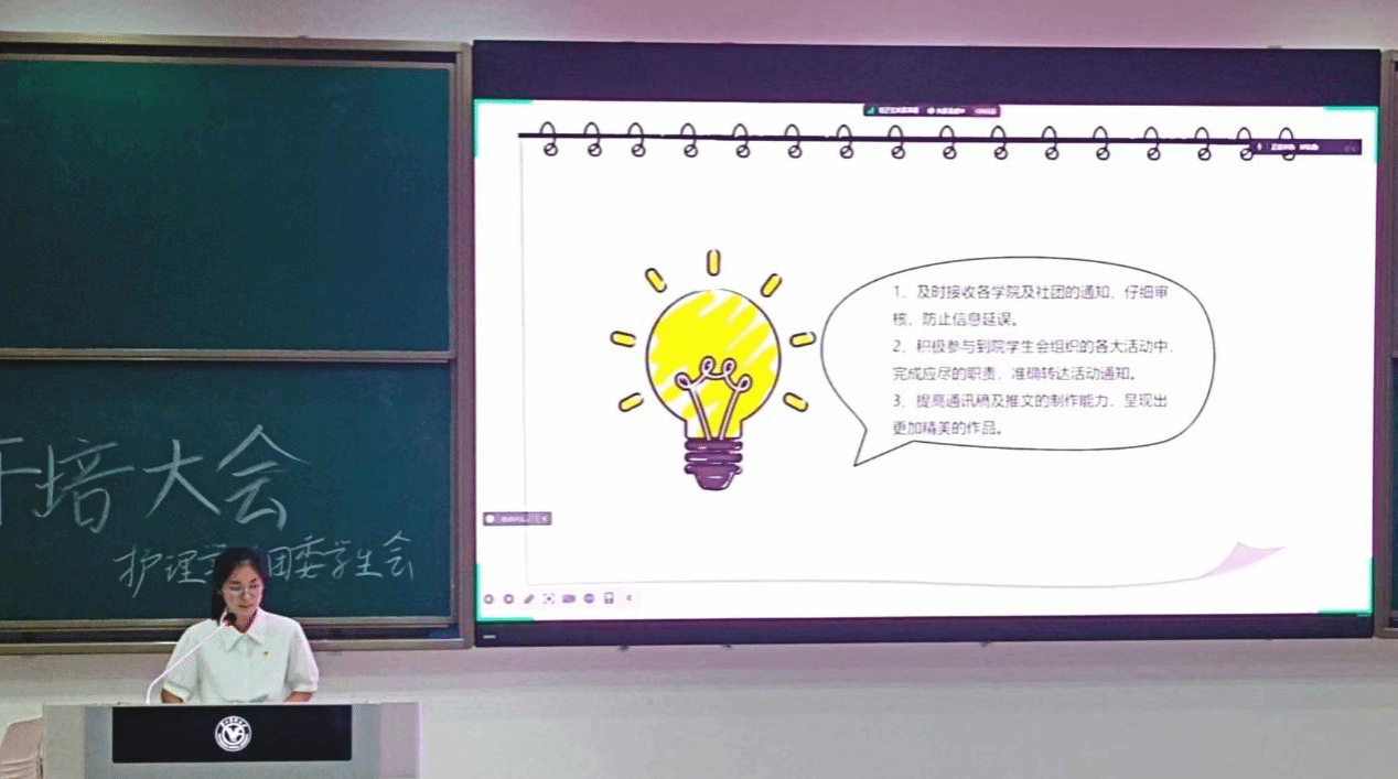欧丽娅主任以“学思践悟强本领,砥砺前行勇担当”为主题,对部长们进行了团委学生会工作要点的分析、工作方式方法的培训,并与干部们讨论了如何更好地推进落实本学期的重要活动与活动推进中的注意事项,对各部门所出现的问题进行释疑解惑。