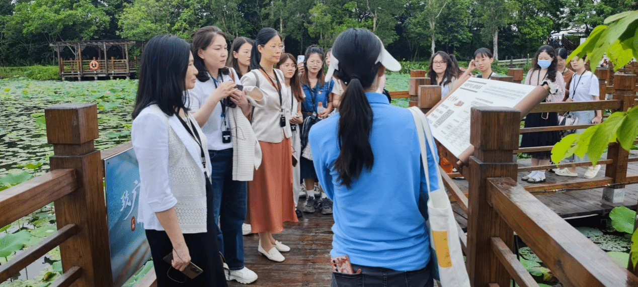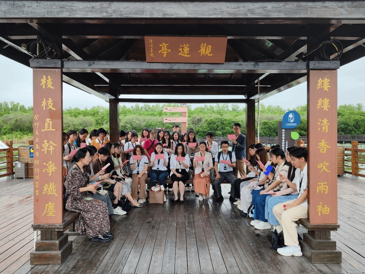 上午,全体师生党员及入党积极分子来到南沙湿地廉洁文化教育基地清莲湾开展党纪学习教育现场教学活动。在讲解员的引导下,大家漫步在廉洁文化思想理念与湿地自然景观融为一体的九曲荷花池,品读清官廉吏故事,赏析廉洁经典诗词。“予独爱莲之出淤泥而不染,濯清涟而不妖,中通外直,不蔓不枝……”,在活动现场,师生们共同吟诵廉洁经典古诗词《爱莲说》,深刻体会诗词中蕴含的廉洁文化思想内涵,让清廉之风润化心灵,筑牢崇廉向善的思想根基。