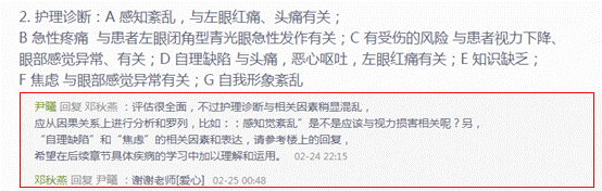 课后督导学生按时完成各章节的课后在线测验,积极参与班级群在线讨论,老师通过在线直播对《五官科护理学》第二、三章的重要知识点进行回顾,对学生在案例讨论和章节测验中的共性问题进行点评,同时为学生答疑。