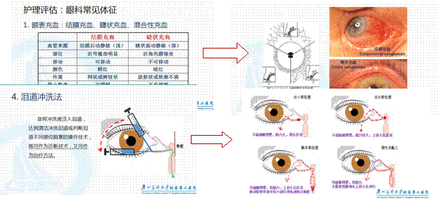 其次,眼科护理的教学内容专科性非常强,为便于学生理解,开篇均先对解剖和生理的基础知识进行回顾,时选用清晰度高的视频、动态图进行展示。在疾病知识方面,制作表格和思维导图对重点难点内容进行总结和分析,同时,对临床症状和体征的讲解,提供典型的图片附以中英文描述,帮助学生理解。在疾病的治疗和护理专科操作技术部分,通过临床实操的视频演示,使学生有更直观的学习体验,提高学生对这门课程的兴趣。