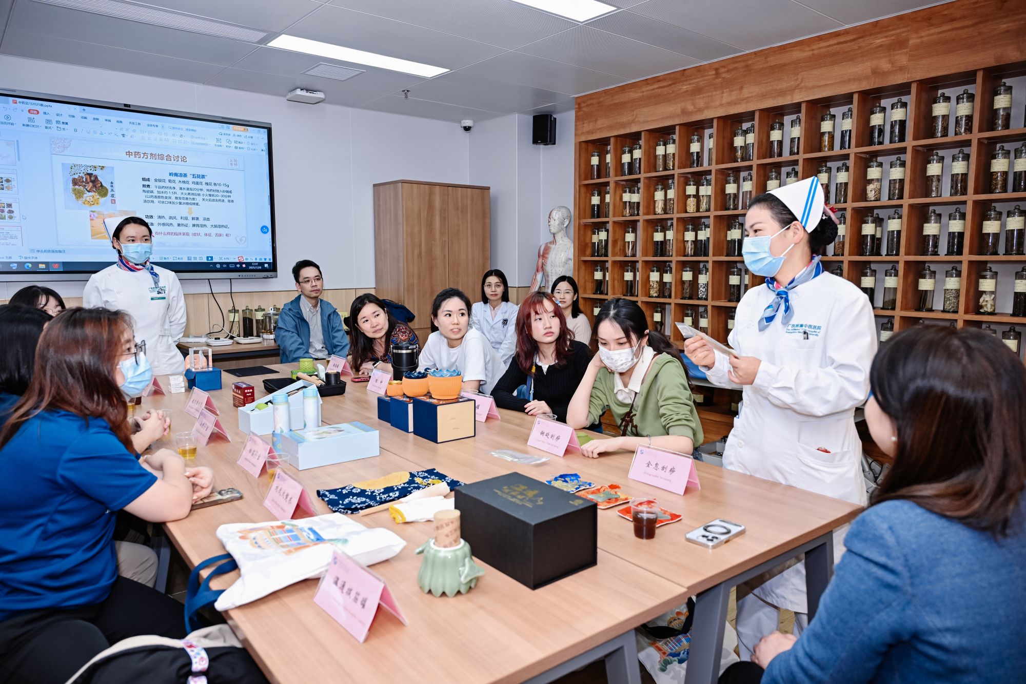 在学生交流环节中,两校学子围绕中西医结合护理模式与临床实践等议题展开了深入讨论。来访师生还参观了我校医学模拟教育中心与科技展览馆等特色教学场所。在医学模拟教育中心,学生们亲身参与急症应急处置、精准护理操作等沉浸式模拟训练,在高度还原的临床场景中感受设备的仿真程度与科技含量;而在古色古香的中医馆内,则近距离观摩了艾灸、拔罐等中医外治技术,部分师生还主动体验了脉诊与药材辨识等项目,对中医药的辨证施治与实践应用表现出浓厚兴趣。
