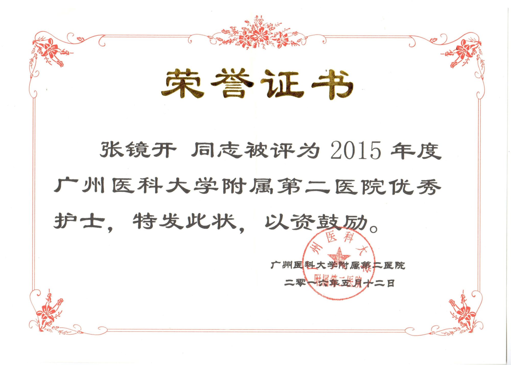附属第一医院的进修学习,张镜开已熟练掌握了各种抢救与配合的知识与技能,如高质量CPR、气管插管、电除颤、机洗胃、体外起搏、呼吸机使用、ECMO使用及配合等,也对临床工作的良好运行有深刻体会,协助制定急诊分诊标准,胸痛、卒中中心工作指引等,良好的工作效果得到了组织的认可。他曾2008年奔赴汶川当地完成“抗震救灾”医疗支援工作,获得“广州市抗震救灾先进个人称号”;完成2010年第16届亚运会及亚残会等多次医疗保障工作;担任多次如横渡珠江,广马,广交会等医疗保障,均出色完成任务。疫情期间,他坚守第一线,奔赴广州市第八人民医院肩负负压转运工作,出色完成任务。他时刻保持对生命的敬畏之心,为有效救治患者竭尽全力,获得医德医风优秀个人称号;他对科室建设尽心尽力,从分诊信息系统的建设,抢救与配合流程的建立与改善,疫情期间各种指引、流程的制定、落实于质控都渗透着他的努力。2018年张镜开任急诊分诊抢救区护士长,期间工作认真负责,兢兢业业,履行护士长的职责,配合科室推广新技术与进行培训工作。他带领护理团队紧跟科室步伐大力发展起在周边影响较大的较新的急诊分诊信息系统,也更好的贯彻国家“急诊患者分级分区,按病情处置”的宗旨。带领护理团队从对ECMO(体外膜肺氧合)的一无所知到能独立开展,工作效果得到了肯定。进行“创新型冰帽”QCC项目,这个项目获得了医院的QC项目二等奖以及第二届省护理用品创新大赛三等奖。从2008年开始,他开始负责临床带教工作,含省级、市级专科护士,进修,轮科,实习,见习,学院在校学生等各层次护理人员进行带教和授课,教学效果得到了各方的肯定,期间制作人卫慕课及参与授课比赛并获奖。出色的工作得到了肯定,张镜开曾获国家级的急诊医疗改善奖,广州市优秀护士称号、2次获得病区护理质量奖,3次获得医院优秀护士称号。