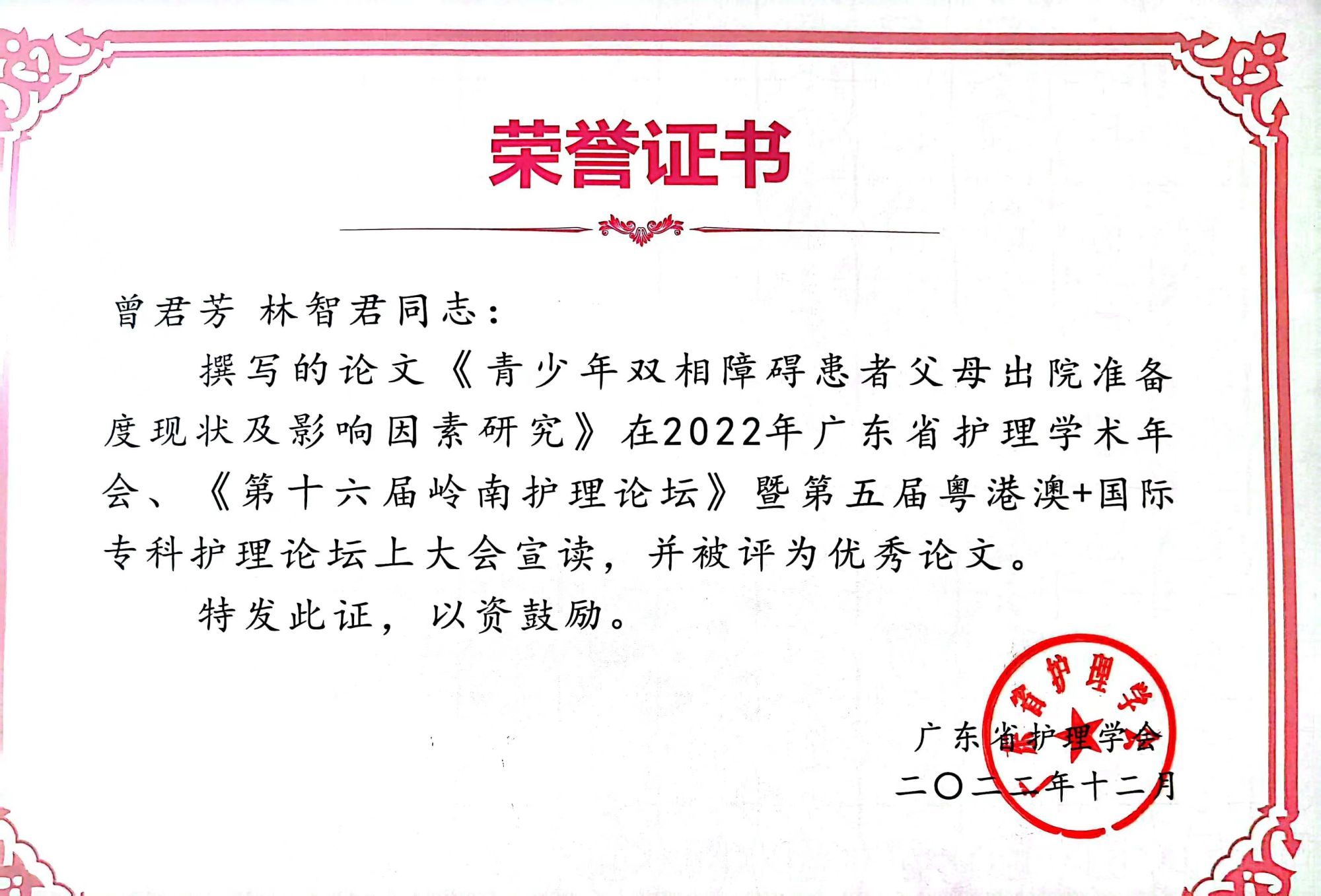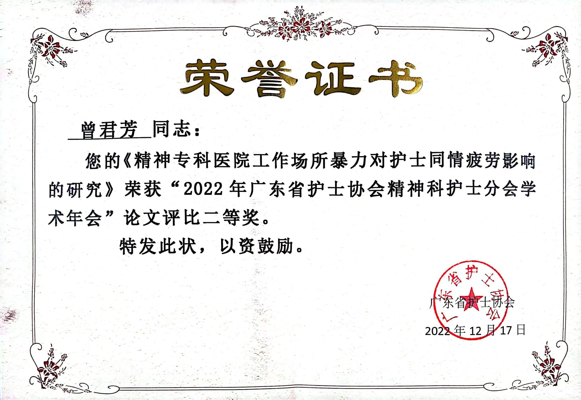 个人先后获“广州市护理学会优秀会员”“优秀护士”“优秀教学秘书”“优秀带教老师”“年度专利奖”荣誉称号。